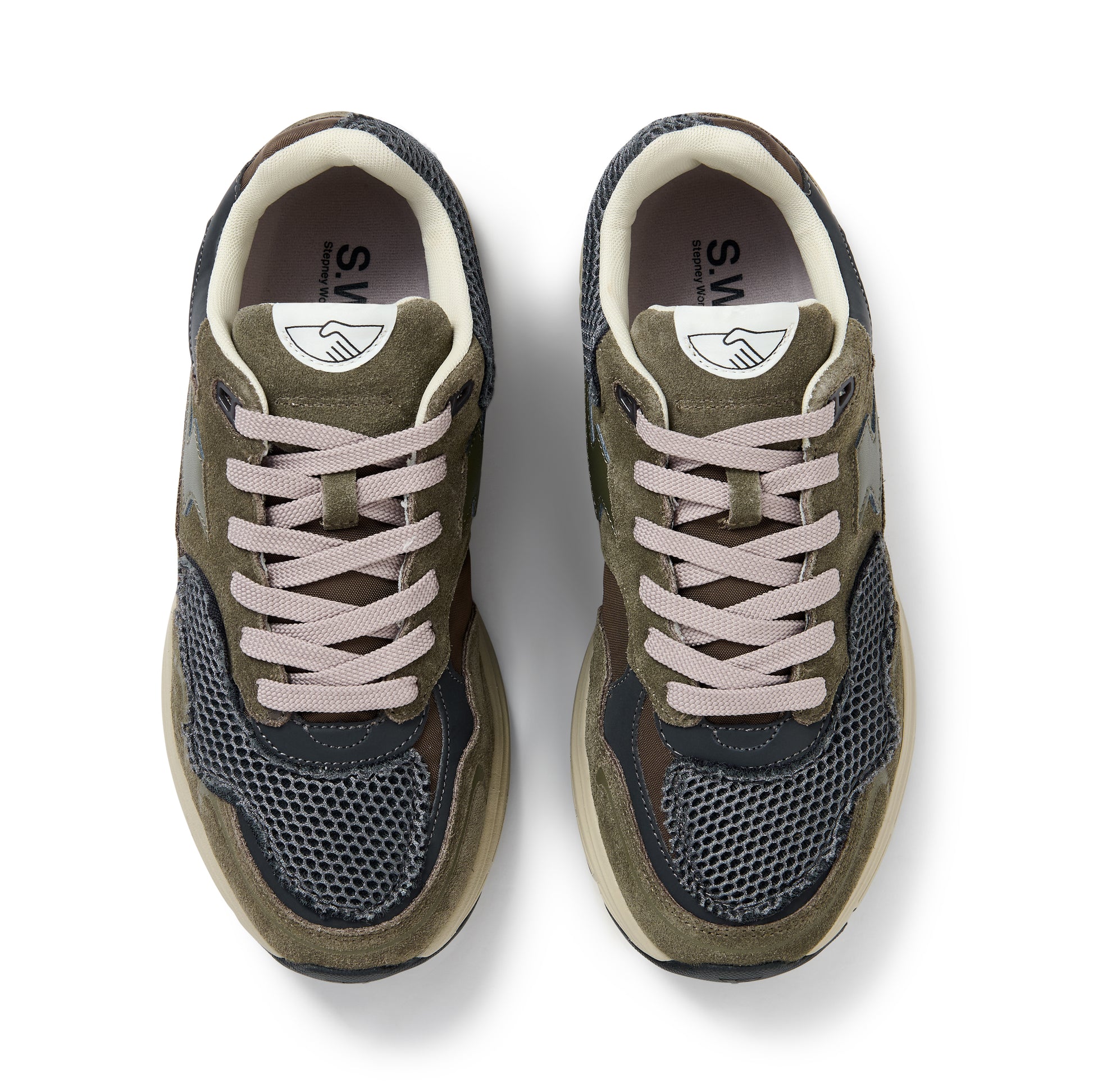 AMIEL S-STRIKE features an updated asymmetric mesh overlay panel design. Mesh tongue panels create a layered collar aesthetic, while raw-edge detailing is overlayed on the toe vamps and medial collar areas for a contemporary finish. Technical nylon uppers are paired with padded sneaker mesh materials and Woodland coloured tonal suedes. 3M S-Strike panel features our gold-foil brand messages. Constructed on our 3-part lightweight technical running sole consisting of a cushioned light EVA midsole, durable rubber bottom sole tread, and supportive TPU S-Strike heel-clip for stability.