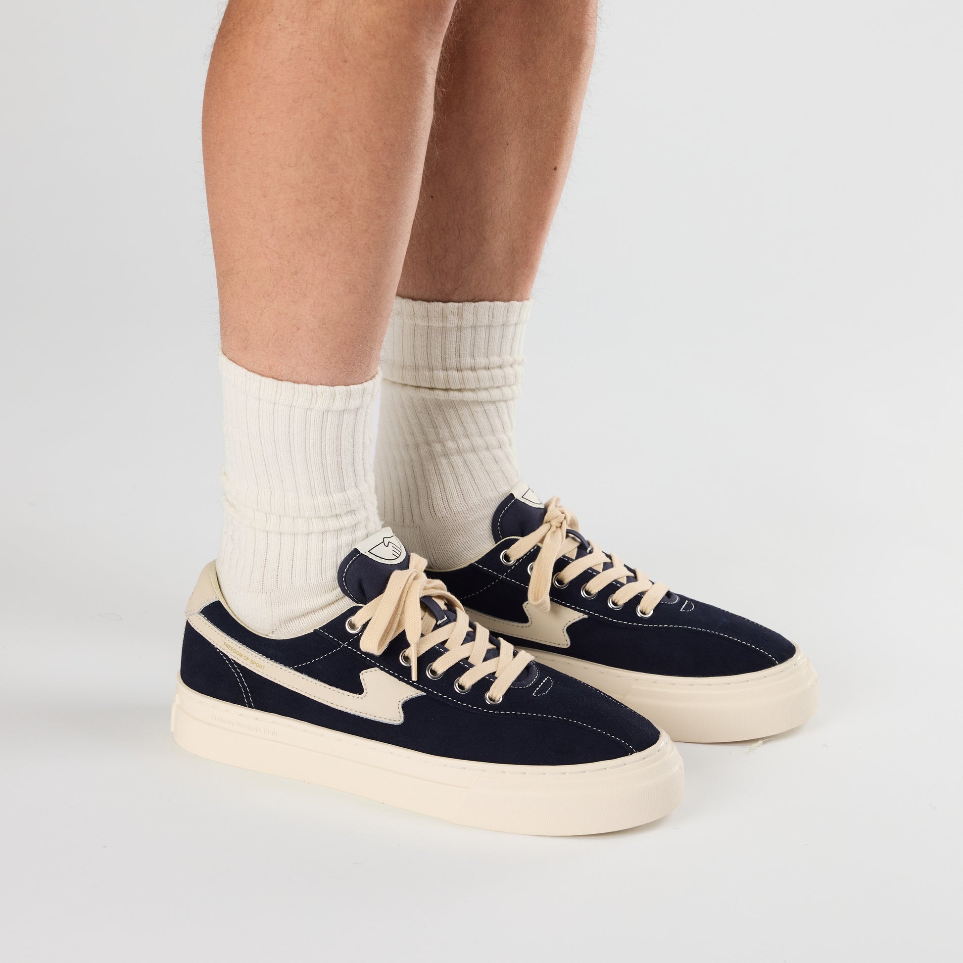 Cupsole version of the iconic DELLOW S-STRIKE sneaker. Soft suede in new rich NAVY colour with tonal cream leather 'S-STRIKE' panels and gold foil branding & brand message details. Featuring a soft padded nylon tongue as a sports comfort detail accompanied by our cemented cupsole construction for added strength and durability.