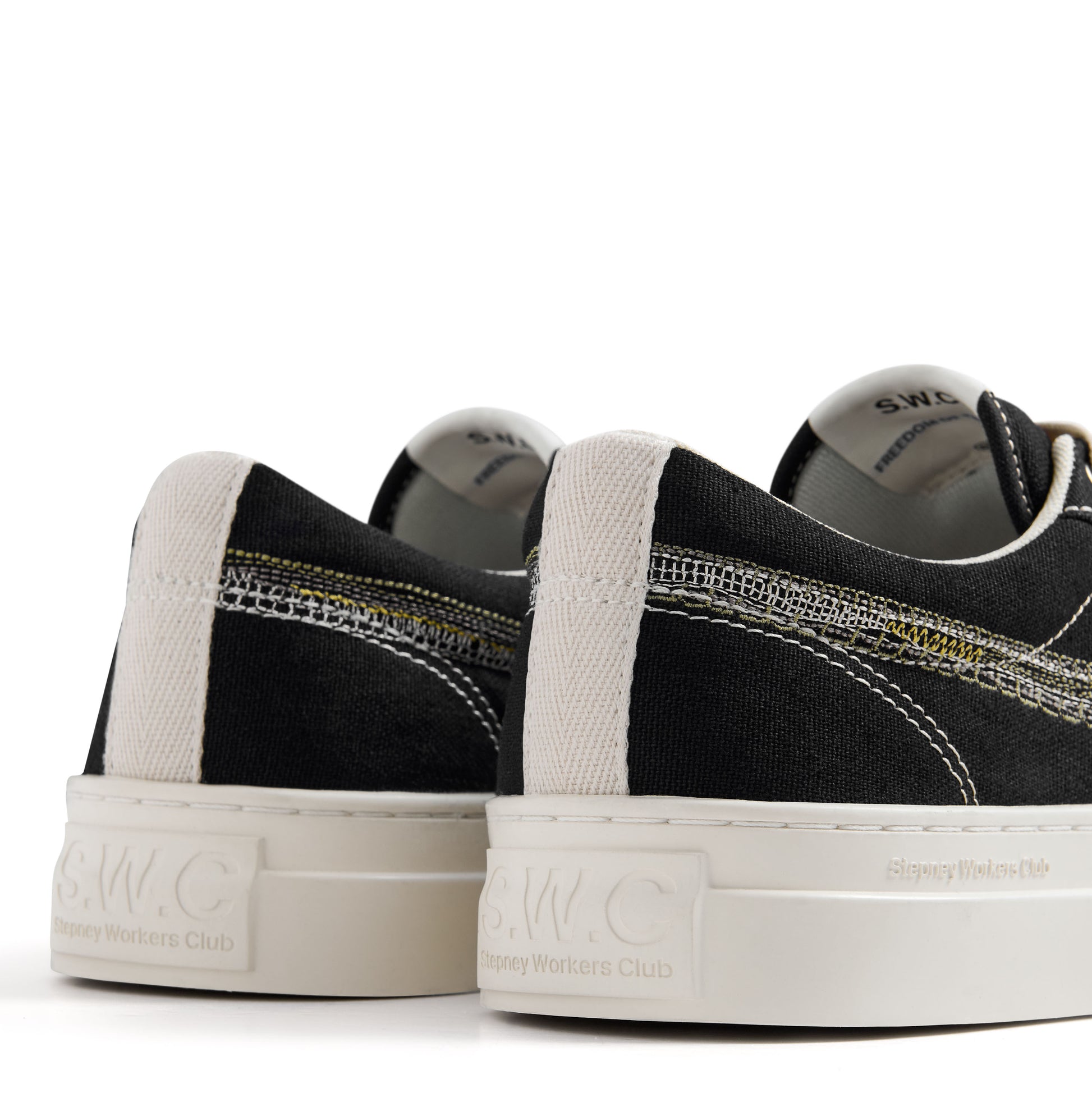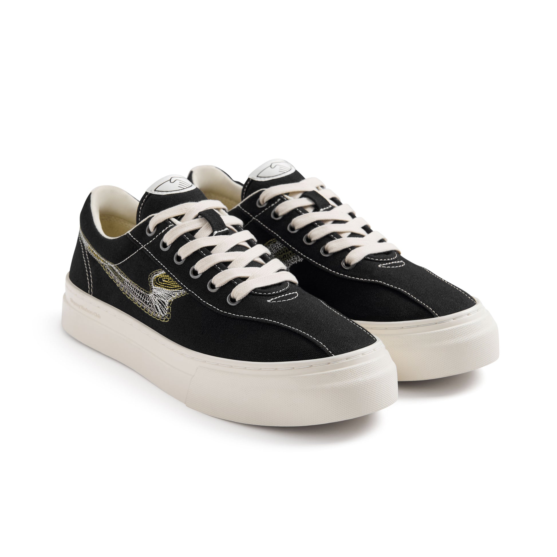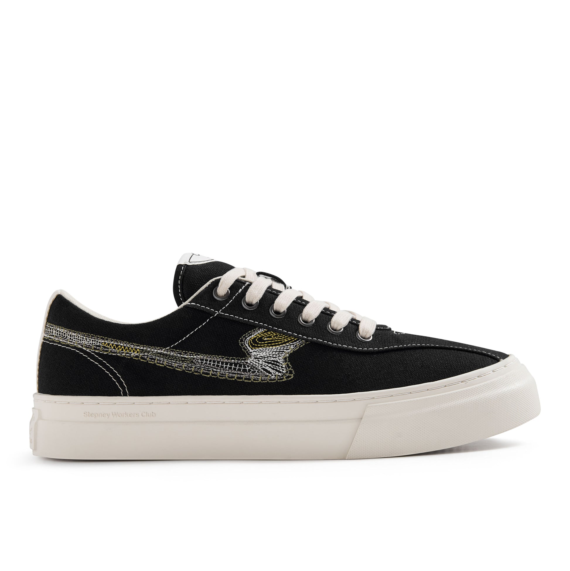 Our iconic DELLOW S-STRIKE cupsole sneaker. It is constructed using 12 oz black cotton canvas upper with S-Strike panels made from 'Repair Stitch' embroidery in 4 subtle tonal colours. Repair stitch design is asymmetric with the outside profile differing from the inside profile. Also featuring a soft padded nylon tongue as a sports comfort detail.