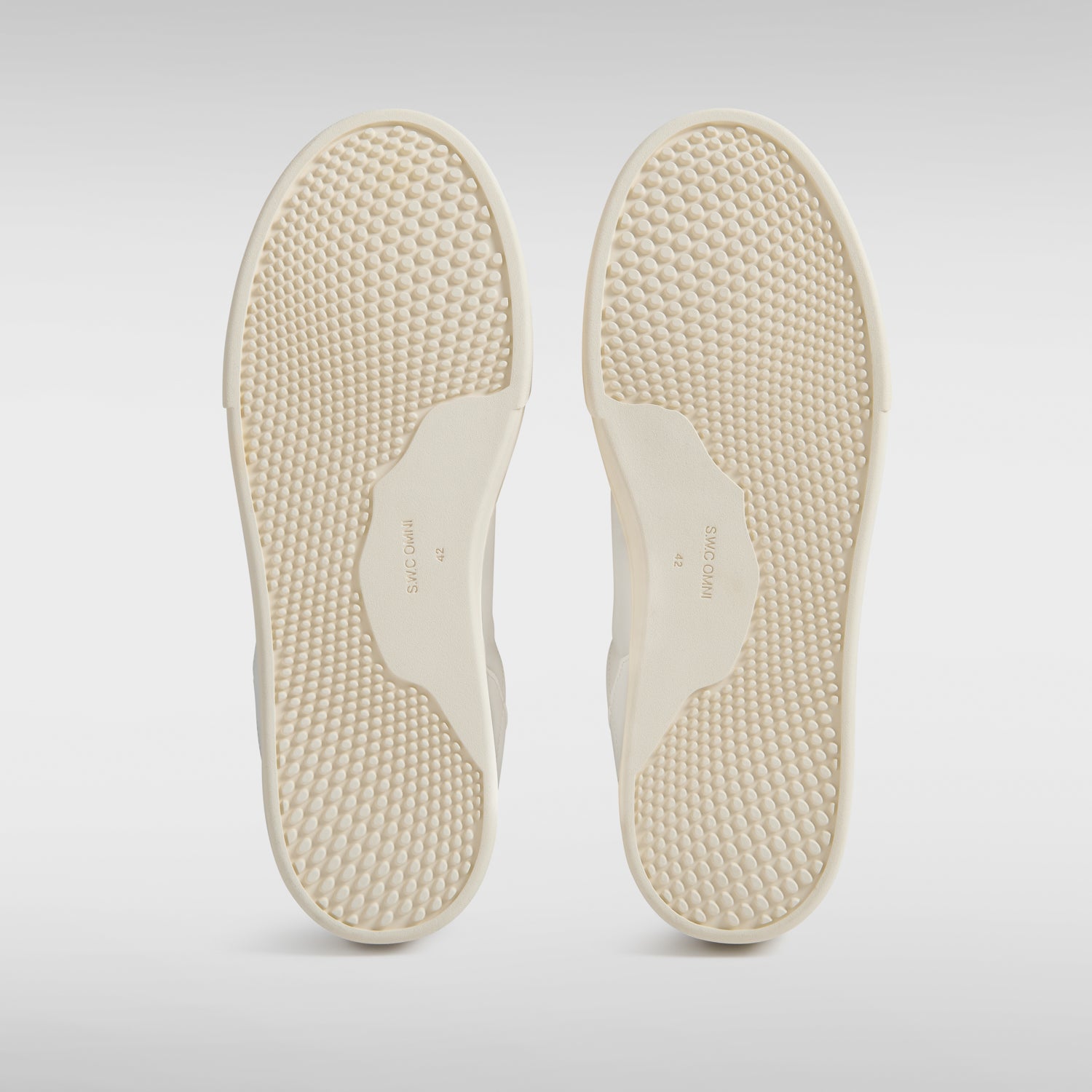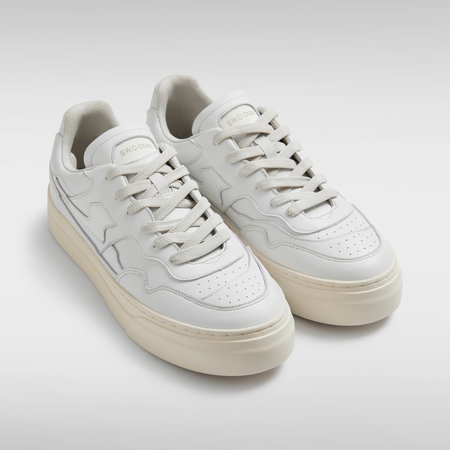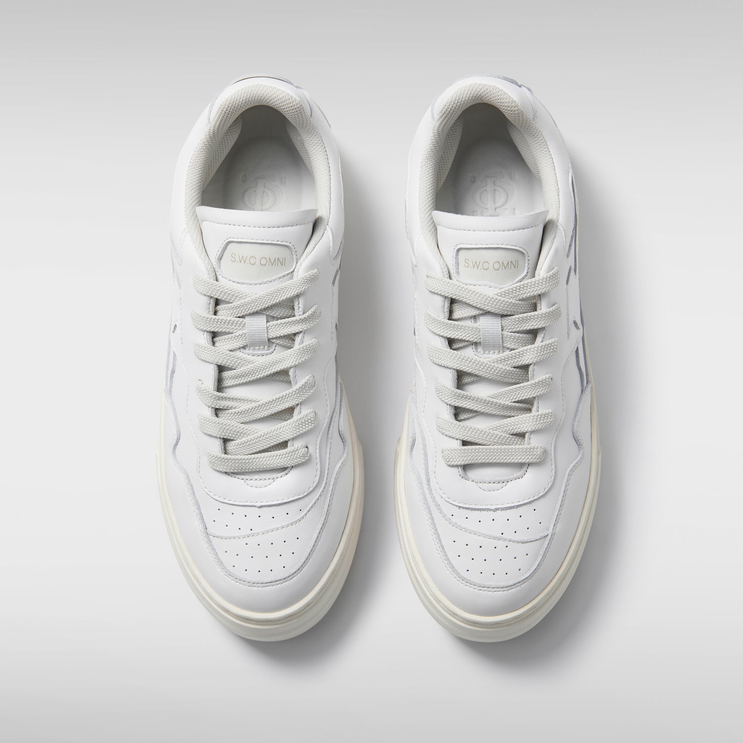 Court sneaker upper featuring asymmetric 'OMNI' panel detailing with raw edging and tonal stitching.