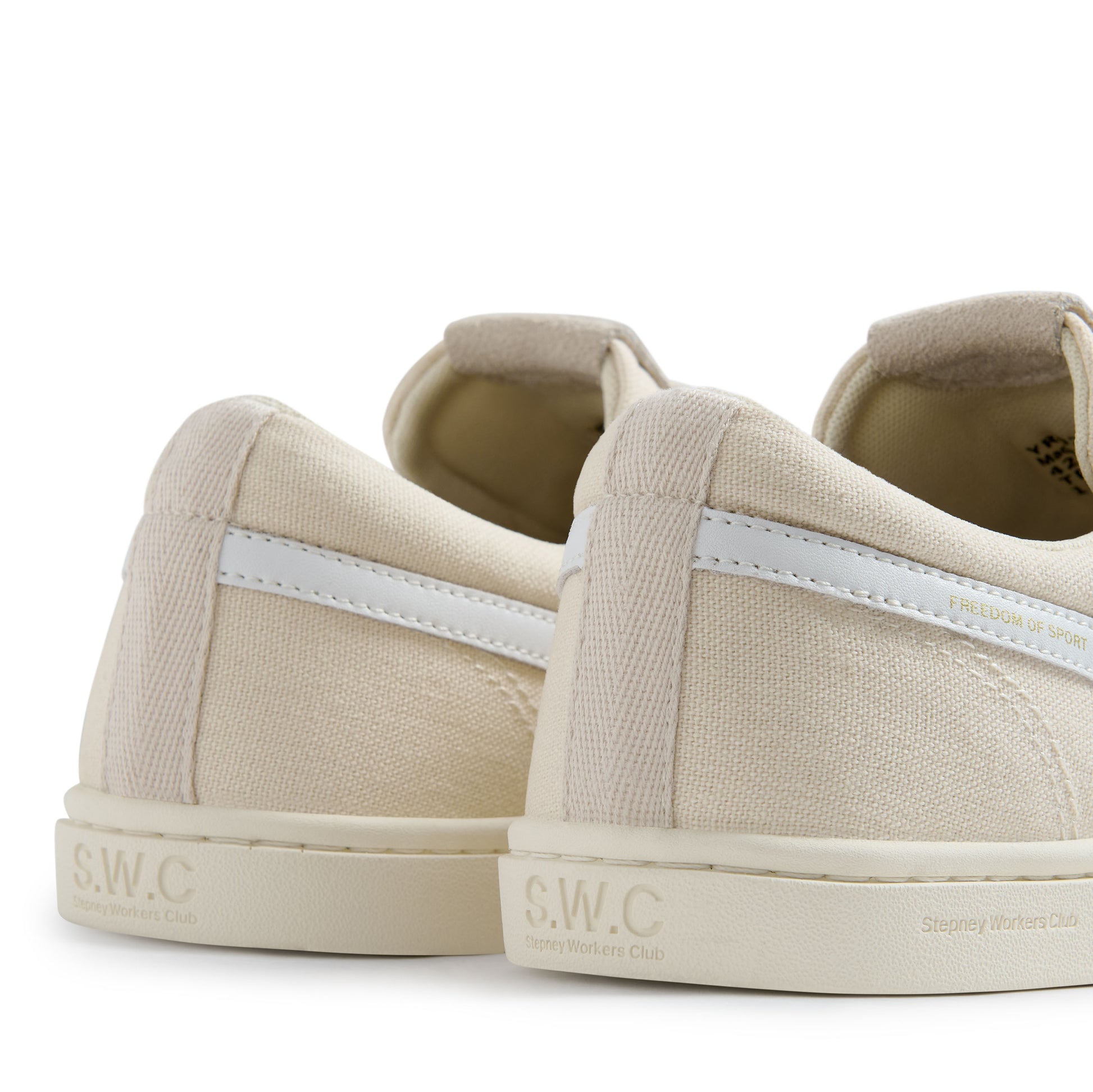 New for SS26, a unique low-profile cupsole with mono-sidewall proportions and plenty of S.W.C design DNA. Cushioned underfoot and flexible. Made with our hardwearing 12.Oz cotton canvas and featuring contrast white leather S-Strike trim. Upper pattern design is inspired from our iconic DELLOW sneaker with new details and differences including forepart arch stitch detailing, paired-back heel backstrap, new tongue panel construction, and debossed suede 'flipped' branded tongue labels.