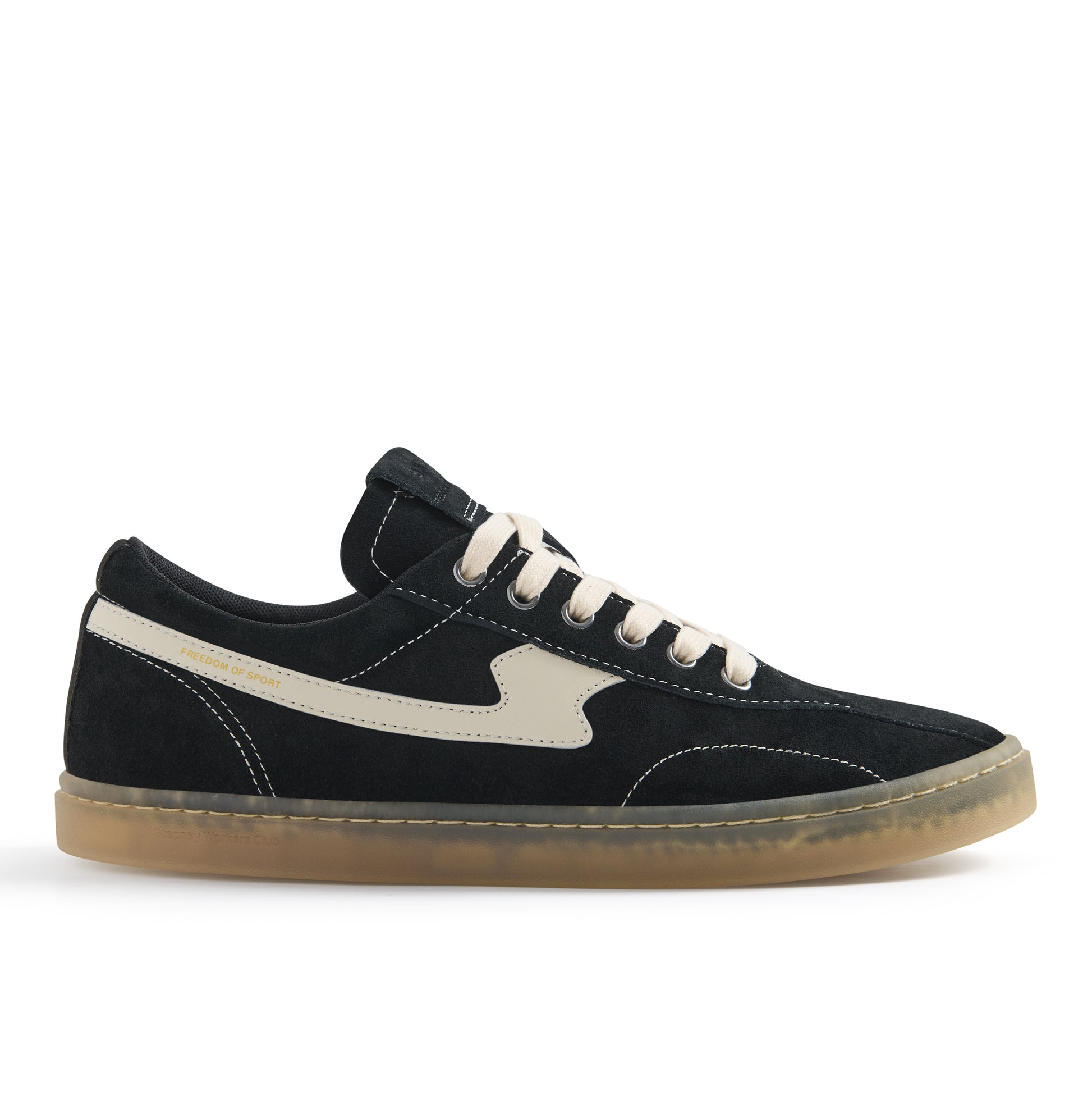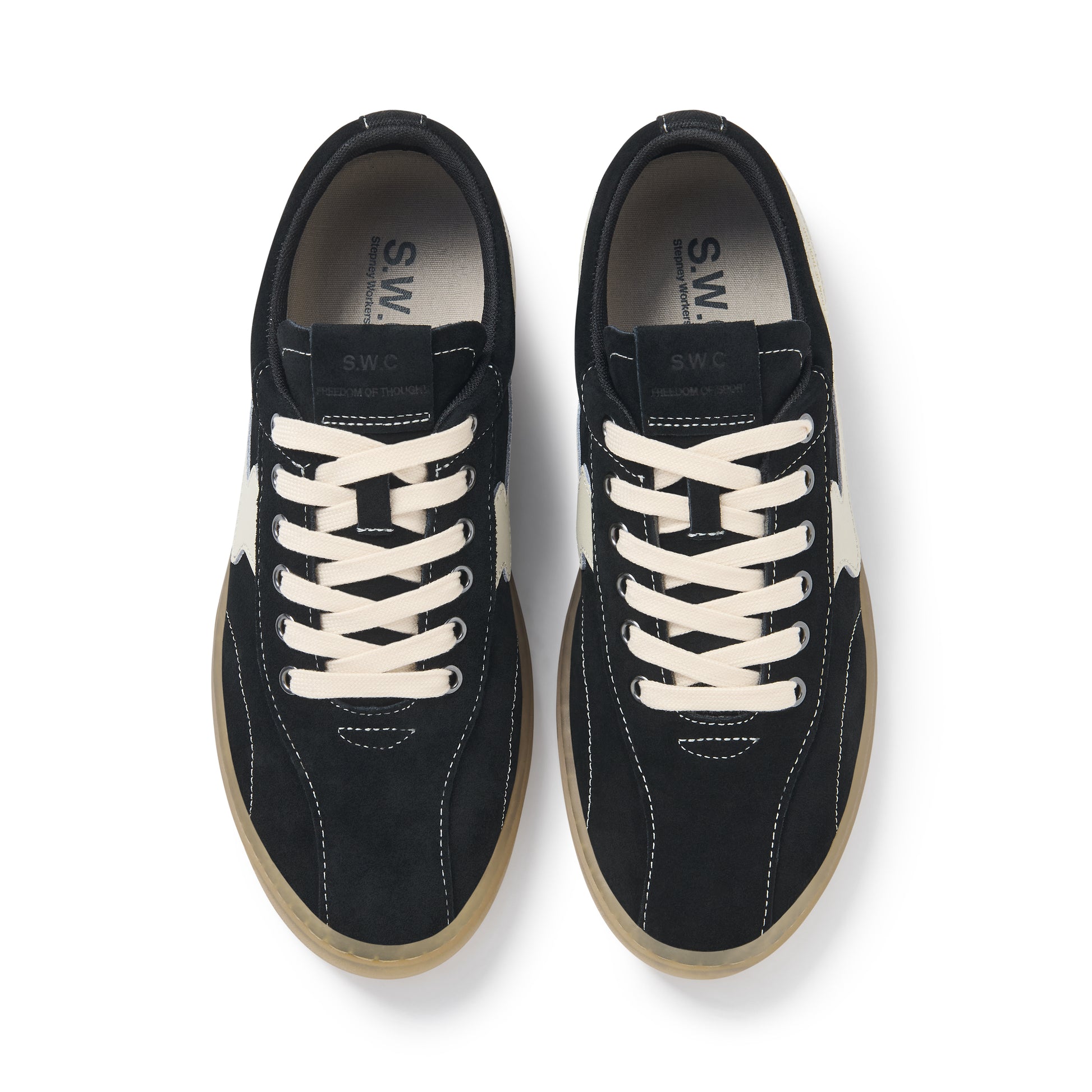 New for SS26, a unique low-profile cupsole with mono-sidewall proportions and plenty of S.W.C design DNA. Cushioned underfoot and flexible. Made with soft black suede and featuring contrast cream leather S-Strike trim on our translucent honey rubber sole. Upper pattern design is inspired from our iconic DELLOW sneaker with new details and differences including forepart arch stitch detailing, paired-back heel backstrap, new tongue panel construction, and debossed suede 'flipped' branded tongue labels.