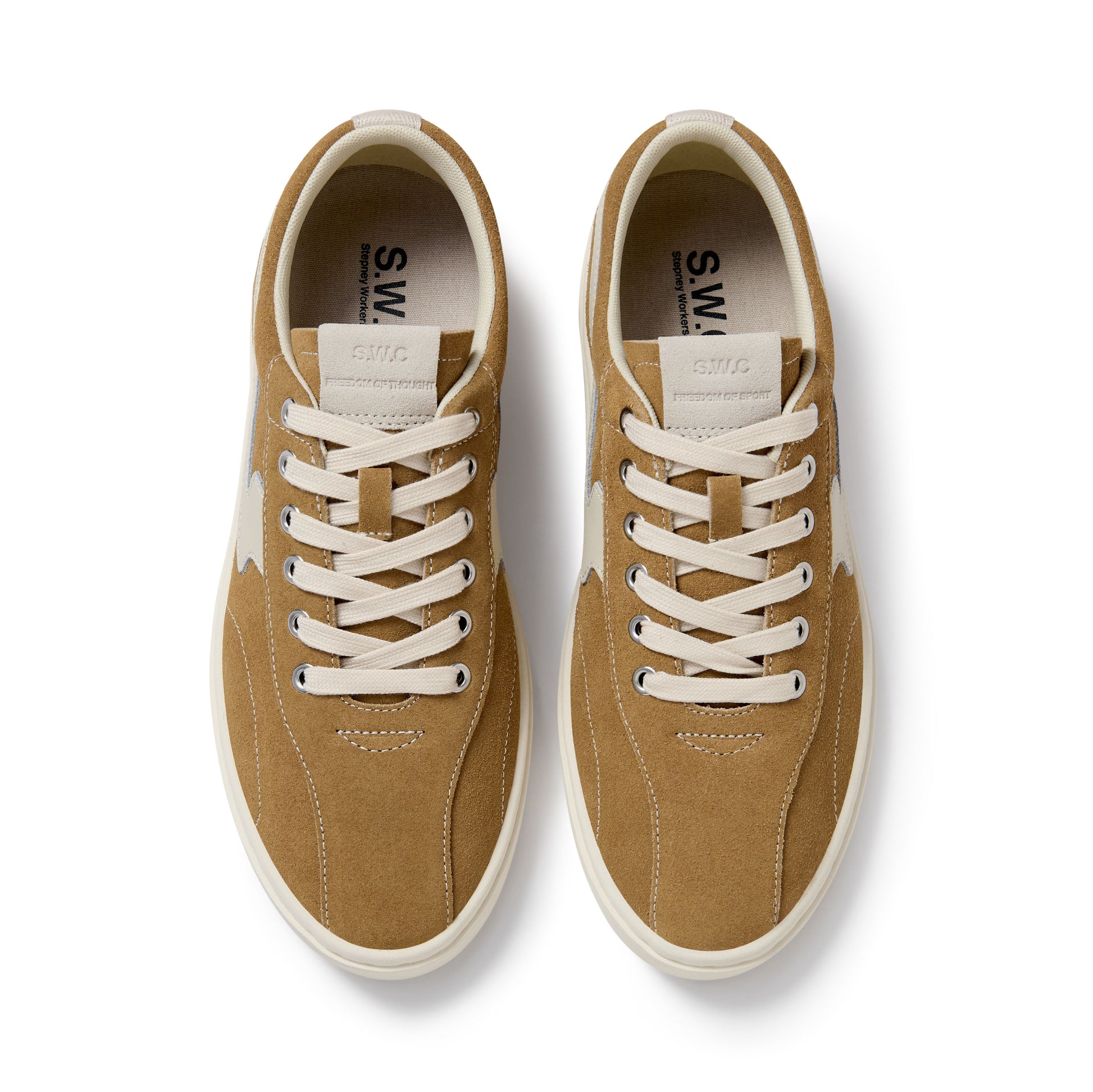 New for SS26, a unique low-profile cupsole with mono-sidewall proportions and plenty of S.W.C design DNA. Cushioned underfoot and flexible. Made with soft camel suede and featuring contrast cream leather S-Strike trim on a cream rubber sole. Upper pattern design is inspired from our iconic DELLOW sneaker with new details and differences including forepart arch stitch detailing, paired-back heel backstrap, new tongue panel construction, and debossed suede 'flipped' branded tongue labels.