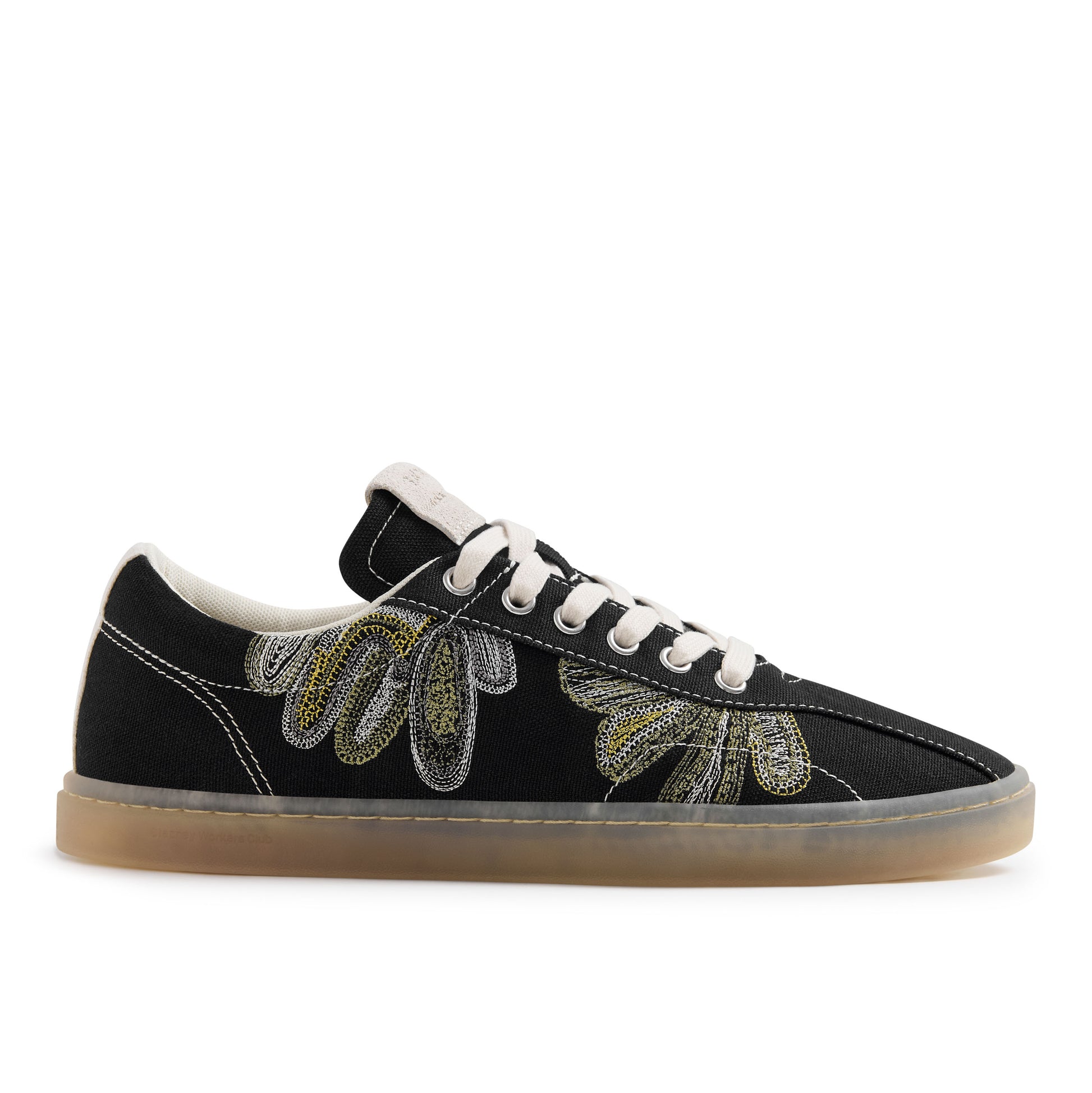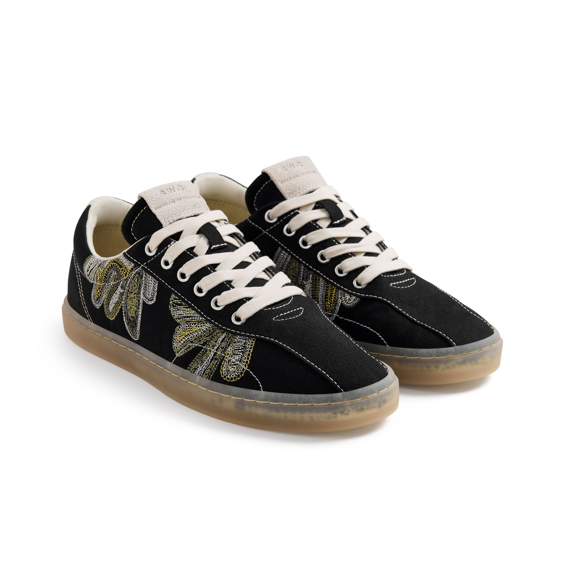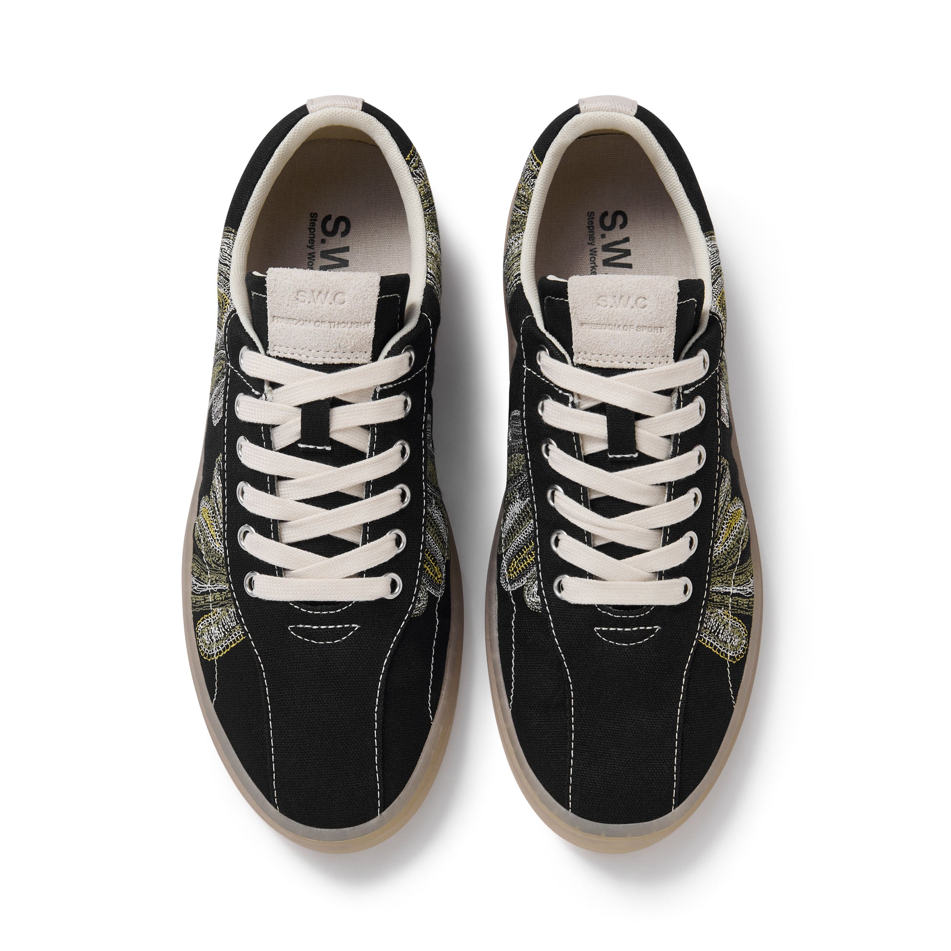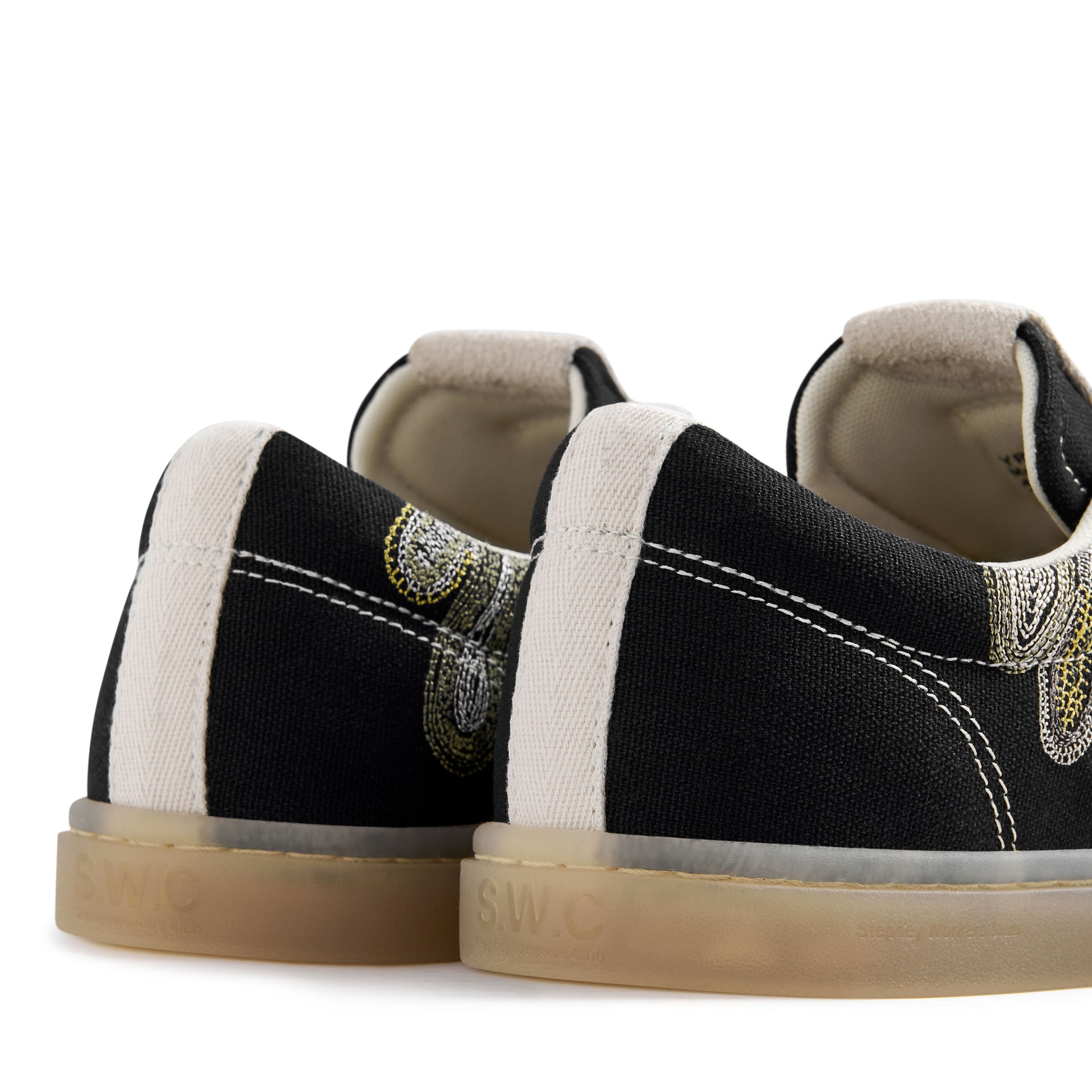 New for SS26, a unique low-profile cupsole with mono-sidewall proportions and plenty of S.W.C design DNA. Cushioned underfoot and flexible. Made with soft black suede and featuring a translucent 'milk' rubber sole, . Upper pattern design is inspired from our iconic DELLOW sneaker with new details and differences including forepart arch stitch detailing, paired-back heel backstrap, new tongue panel construction, and debossed suede 'flipped' branded tongue labels.